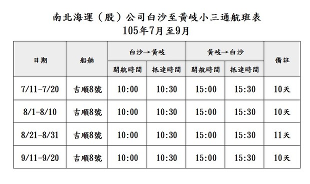 南北海運105年7-9月份黃岐航線航班表