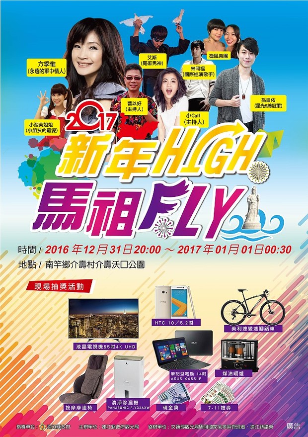2017馬祖「新年HIGH‧馬祖FLY」跨年晚會內容敲定,邀請多組藝人表演,現場還有多個摸彩大獎,歡迎鄉親踴躍參加。(圖:縣府觀光局提供)