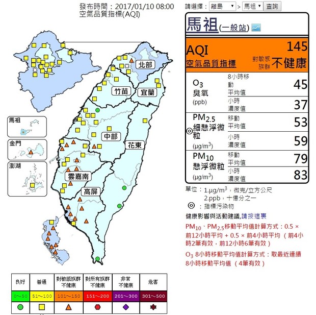 目前(1/10日08:00)空氣污染指標(AQI)已至145,為對敏感族群族群有影響,一般民眾如果有不適,如眼痛,咳嗽或喉嚨痛等,應該考慮減少戶外活動。學生仍可進行戶外活動,但建議減少長時間劇烈運動。
