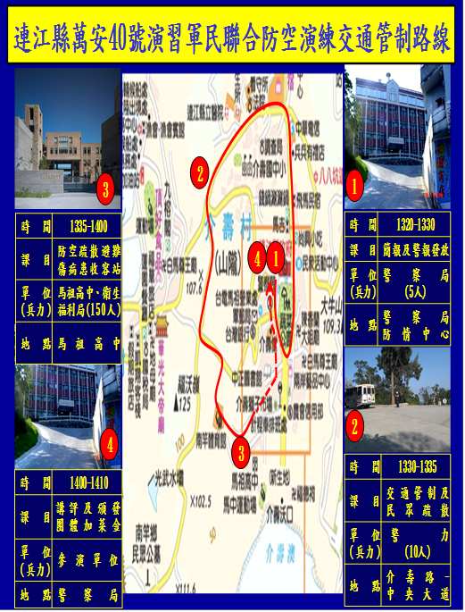 連江縣『萬安40號』演習 --閱讀人次 : 1114 106年度全民防衛動員「萬安40號」軍民聯合防空演習,馬祖地區將於2月20日(星期一)13時30分至14時預演,預演僅警報試放5秒,不實施人員疏散避難及交通管制,2月23日(星期四)13時30分至14時正式演習,本次演習重點為「防空警報傳遞與發放,並實施人員疏散避難及交通管制(管制路線如附圖),於防空緊急警報發放後,實施人員疏散避難及交通管制,屆時請民眾配合事項如下: