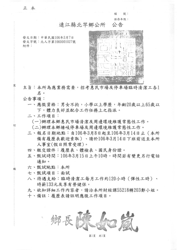 北竿鄉公所招考惠民市場及塘岐停車場臨時清潔工各1名