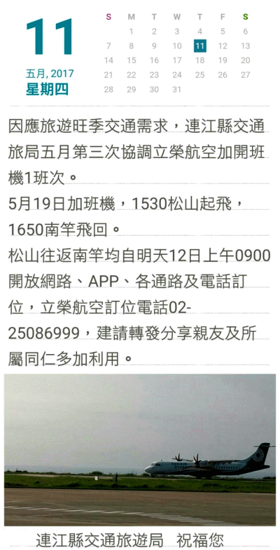 5/19加班機:15:30松山起飛,16:50南竿飛回