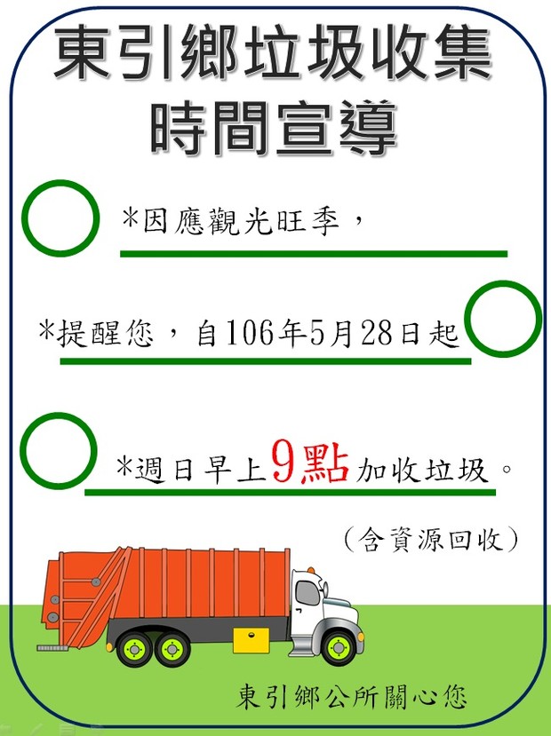 各位東引鄉親大家好,提醒您,因應觀光旺季,自106年5月28日起,星期日早上9點試辦加收垃圾(含資源回收),敬請鄉親多加利用,謝謝。