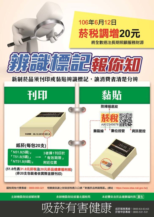 二、為防杜舊菸新價情事,規劃建立新舊菸品識別機制,以供消費者辨識新舊菸品,自修正菸酒稅法之施行日起,納稅義務人依菸酒稅法第7條及菸害防制法第4條規定,按每千支(每公斤)繳納1,590元菸酒稅及1,000元菸品健康福利捐之菸品,紙菸應自行刊印可資辨識之標記,未及刊印部分應黏貼財政部提供之辨識貼紙於菸品容器上,紙菸以外之其他菸品應自行刊印或黏貼財政部指定之識別標記。