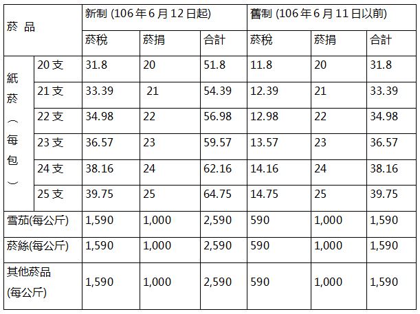 以每包20支裝的紙菸為例,新制施行前,每包菸的菸稅原本是11.8元〔(590元/1000支)×20支〕,新制施行後,每包菸的菸稅將調整為31.8元〔(1,590元/1000支)×20支〕,也就是每包菸增加菸稅20元。所以新制實施後,每包20支的紙菸,實際負擔的菸稅和菸捐合計是51.8元(菸稅31.8元及菸品健康福利捐20元)。