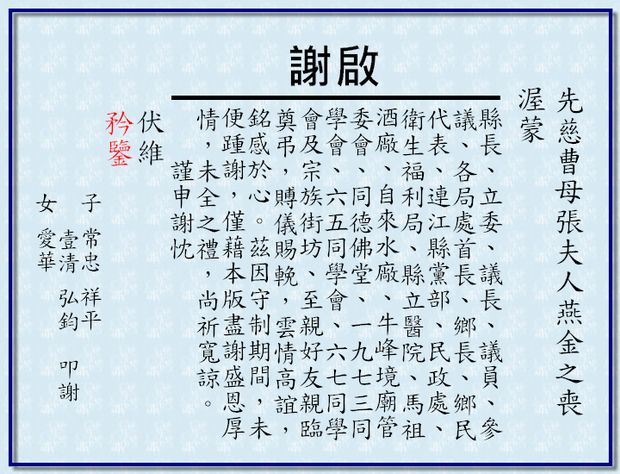 先慈曹母張夫人燕金之喪謝啟