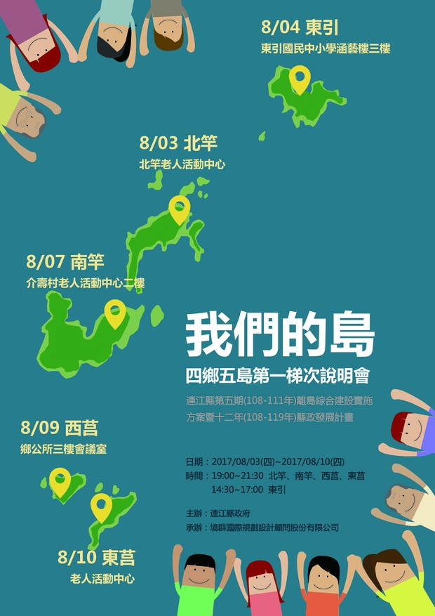 第五期離島綜合建設實施方案暨十二年縣政發展計畫說明會延期通知 --閱讀人次 : 619 連江縣第五期(108-111年)離島綜合建設實施方案暨十二年(108-119年)縣政發展計畫規劃案第一梯次說明會原訂於7/31-8/4辦理各鄉說明會,因颱風影響,南竿、西莒、東莒延後至8/7、8/9、8/10辦理。北竿及東引按原定時間辦理。