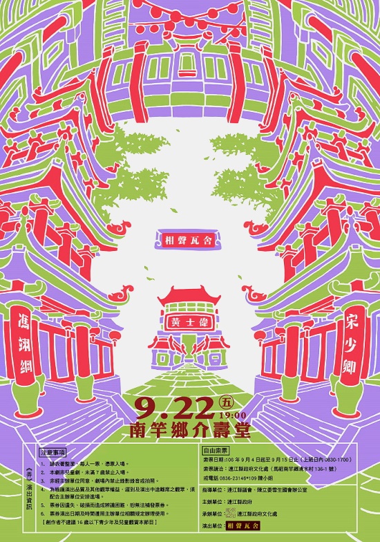 【記者曹重偉報導】喜愛相聲的鄉親有福了,縣府文化處今年首次邀請國內最知名的表演藝術團體「相聲瓦舍」抵馬公演,由當家演員馮翊綱、宋少卿、黃士偉等人聯袂演出該團2017年全新創作《弄》。入場採登記索票制,為維持現場秩序,謝絕7歲以下兒童入場,9月4日起受理登記,請留下觀眾全名、出生年月日及聯絡電話;正式演出期程為9月22日(五)晚間7時於南竿介壽堂。