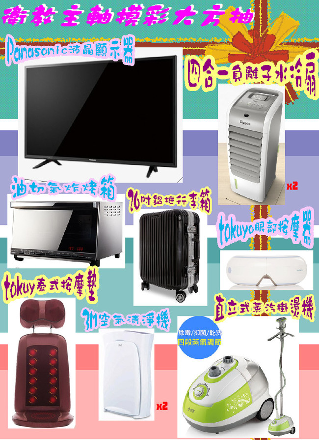 完成闖關之民眾,還可以參加現場摸彩活動,現場提供10項大獎,抽中大獎立即帶回家!獎品包含:國際牌液晶電視、4合1負離子健康水冷扇、3M空氣清淨機、直立式蒸汽掛燙機等10項好禮大放抽!