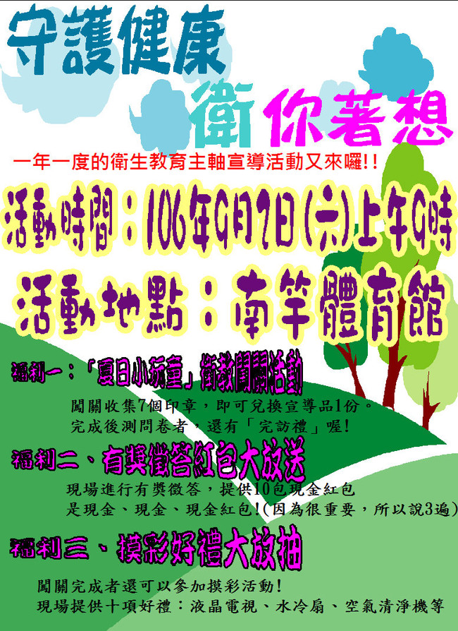 衛教主軸宣導活動又來囉!9月2日9點見 --閱讀人次 : 1082 106年衛教主軸宣導活動「守護健康‧衛你著想」