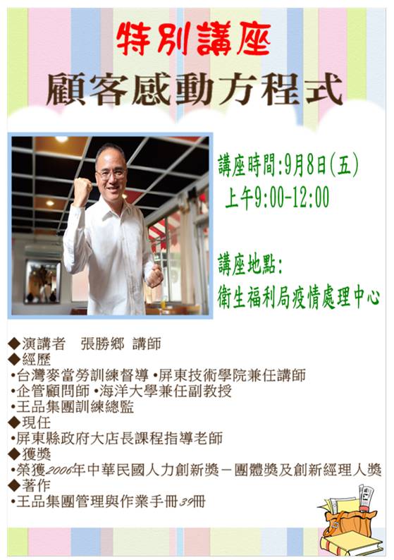 本次特別講座訂於9月8日(五),講座時間及地點:上午9時至12時於衛生福利局疫情處理中心,本次邀請講座之講師學有專精,不管是學界、業界均經驗豐富,能在百忙之中前來授課,實屬不易,希望地區食品業者(餐飲業、販售業者等)及有興趣的民眾能前來汲取經驗提升服務水平與餐飲衛生新知,本局提醒有意參加者請先來電報名(需統計人數以便相關作業),來電報名:0836 -22095 *8880-8885 。