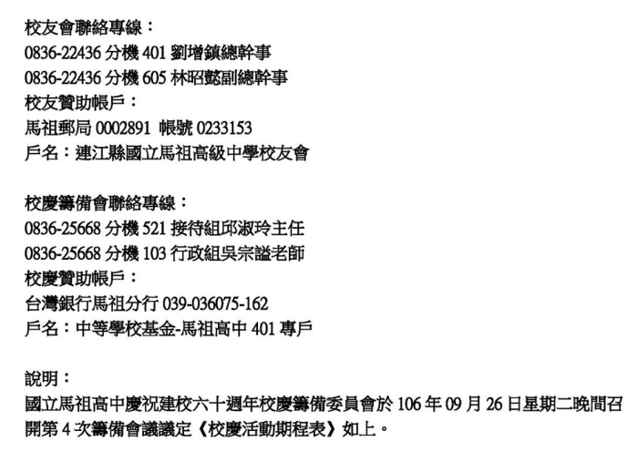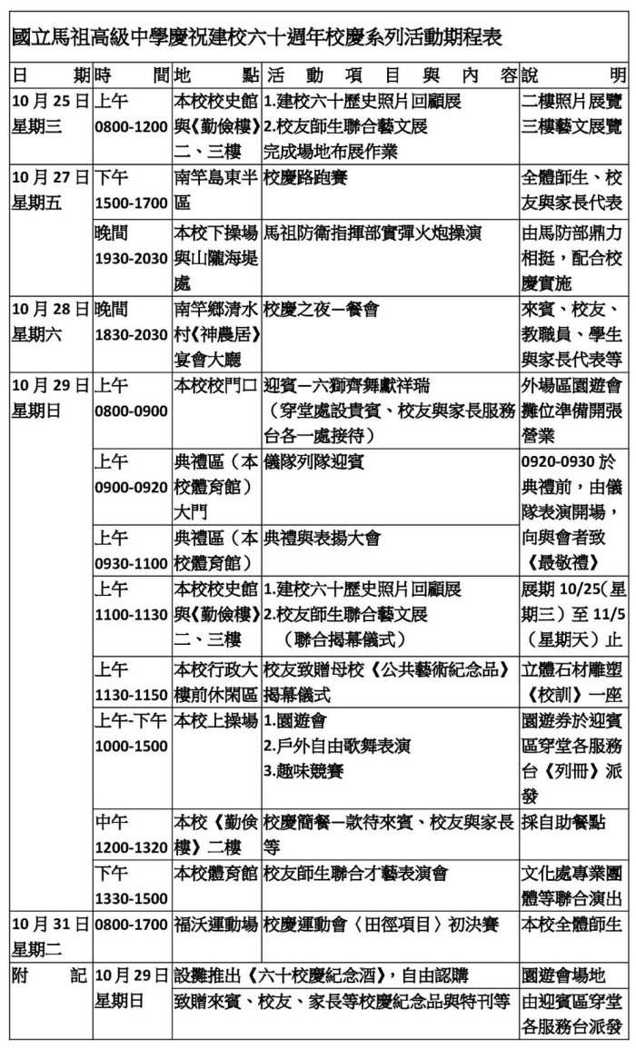 馬祖高中60週年校慶 活動期程定案