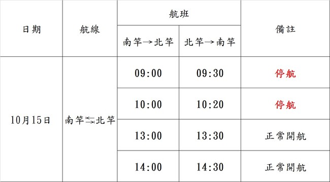 10/15 長億海運 南北竿航班異動