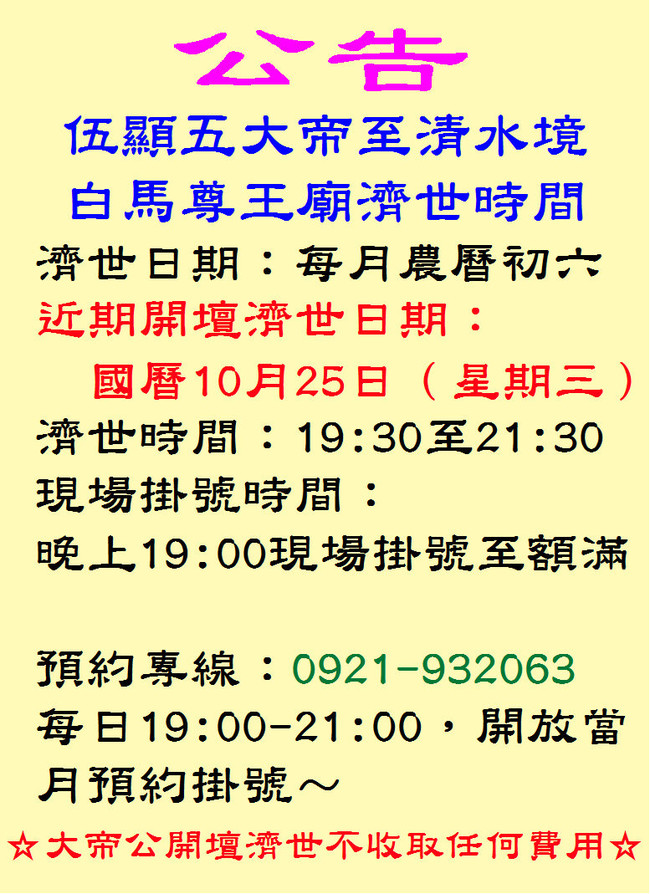 10/25伍顯五大帝濟世公告 --閱讀人次 : 781 國曆10月25日(星期三)伍顯五大帝至清水境白馬尊王廟濟世