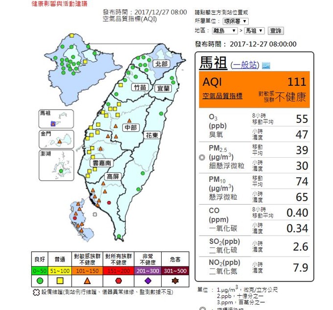 空污指標(AQI)已達敏感族群有影響 --閱讀人次 : 492 目前(12/27日08:00)空氣污染指標(AQI)已至111,為對敏感族群不健康,一般民眾如果有不適,如眼痛,咳嗽或喉嚨痛等,應該避免戶外活動。學生亦避免從事劇烈運動。