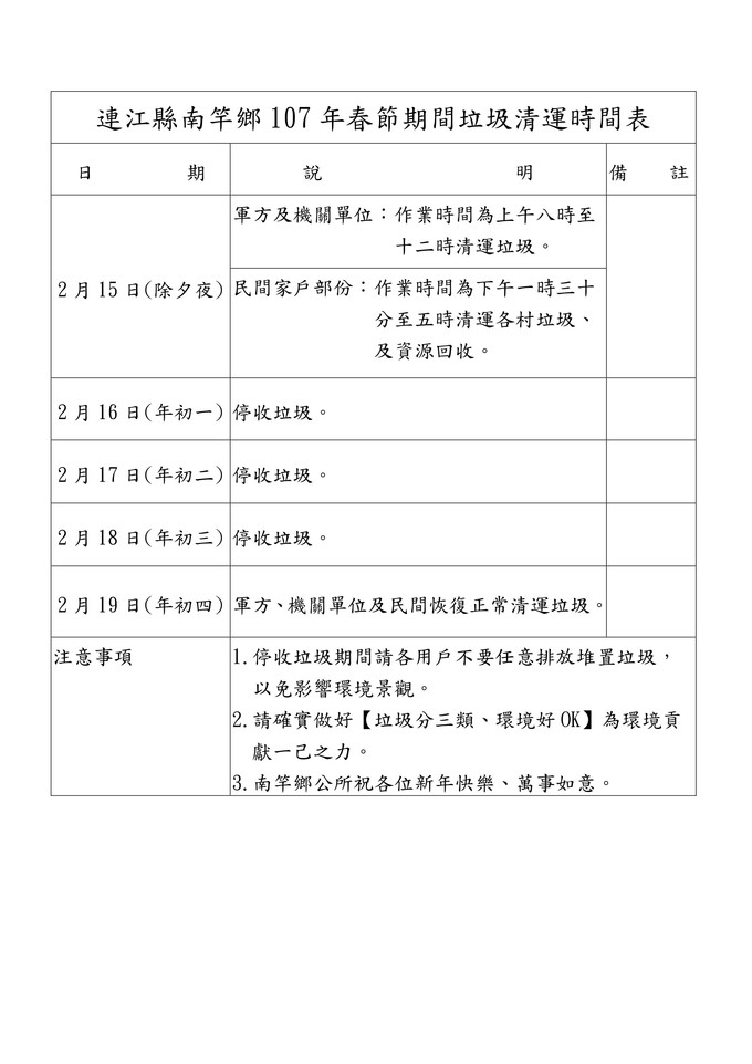 南竿鄉107年春節期間垃圾清運時間表
