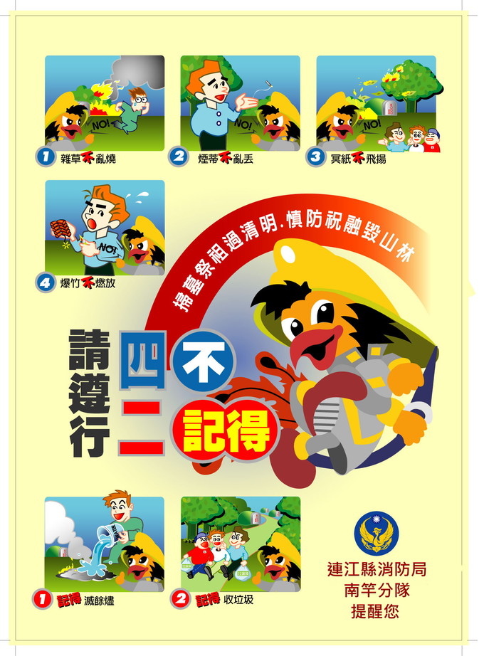 南竿分隊特別呼籲社會大眾,「火苗總因無心而起,防災總是有備而得」,民眾入山掃墓應隨時提高警覺,勿亂丟煙蒂、任意燒雜草,燃燒冥紙應確實熄滅餘火後,始可離去,離去時並請將垃圾一併帶走,切勿因一時的疏忽造成無法彌補的損失,如發現任何可疑狀況請立即撥打119或23821
