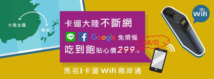 馬祖到大陸就用I愛遛WIFI分享器 無限流量、不降速、1台機器多人分享、輕便好攜帶! 快加入馬祖I卡遛WIFI粉絲專業按讚加分享 即可享有1日/268元的超級優惠唷~LINEID:@nfy8587t
