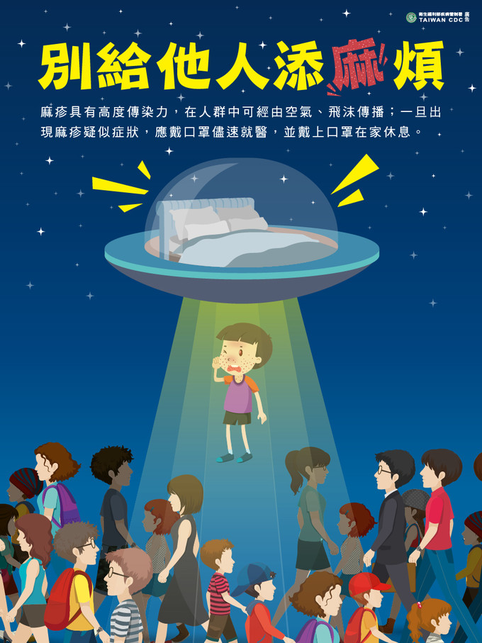 衛福局呼籲,麻疹傳染力極強,患者出疹前後4天最具傳染力,接種麻疹、腮腺炎、德國麻疹混合疫苗(MMR)可有效預防,家中如有滿1歲幼兒,請攜至合約院所接種疫苗;不確定是否曾感染過的中壯年人,及部分幼年曾接種疫苗,擔心抗體隨年齡增長而減少的青年族群,赴流行地區前可至旅遊醫學門診評估接種需求;另避免帶未滿1歲或未接種疫苗的嬰幼兒至流行地區,如須帶6個月以上未滿1歲的嬰兒前往,出發2週前可至衛生所或合約院所接種1劑疫苗。