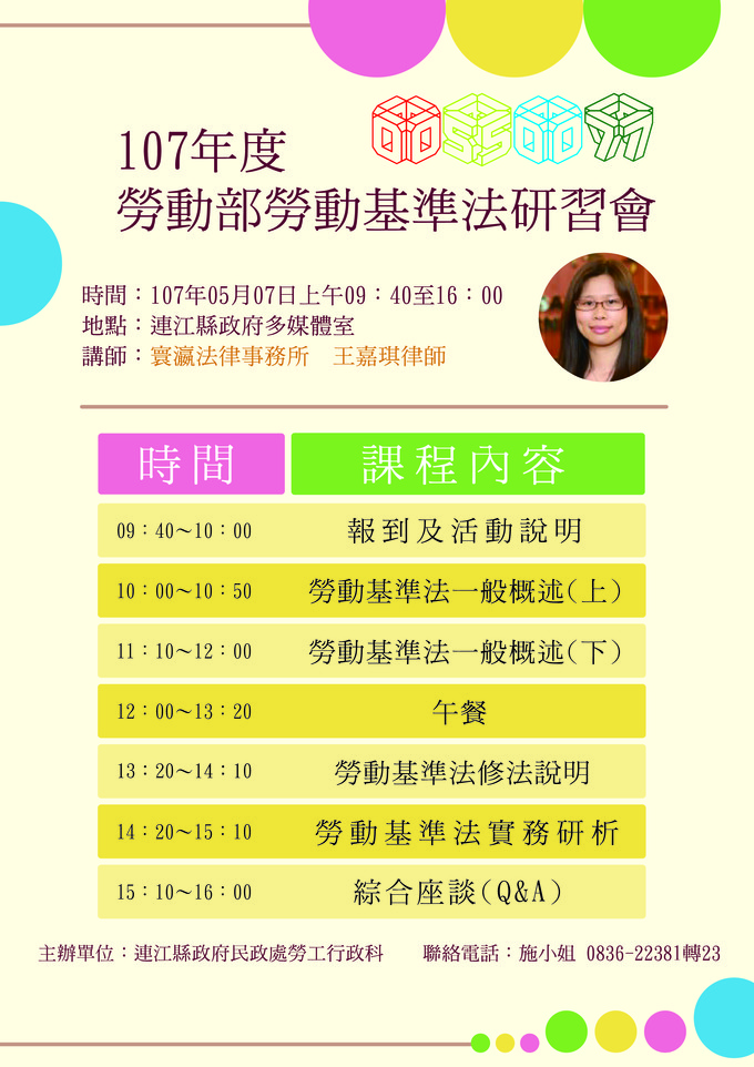 本次課程由勞動部勞動條件及就業平等司針對法令規定及實務進行綜合座談,並由本府聘請律師講說勞動基準法司法實務研析。若有任何法律問題亦可在研習中諮詢律師,歡迎大家踴躍參加。(本次研習活動敬備午餐。為響應環保紙杯減量,參加人員請自備茶杯與會。)2.
