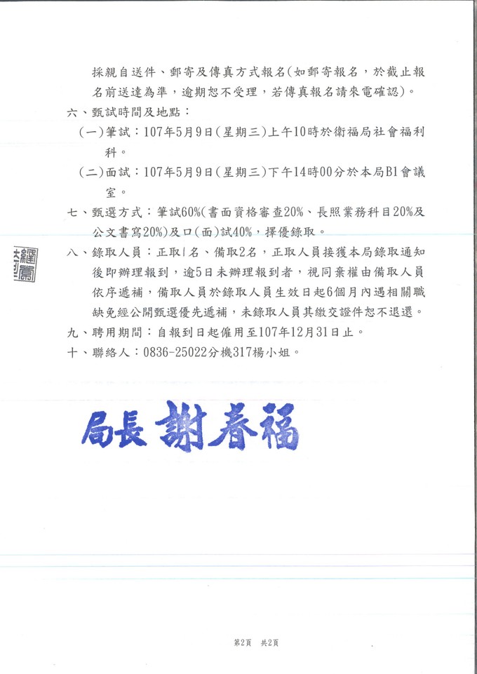 衛福局甄選長照約用人員正取1名備取2名 --閱讀人次 : 760