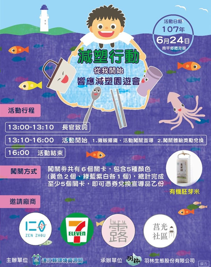 本次活動於24日(日)下午1時至4時於連江縣南竿體育館舉辦,民眾於入口服務台領取闖關券,完成減塑任務後,即可獲得CAS認證通過,具完整產銷履歷之有機胚芽米乙包,名額有限,送完為止。