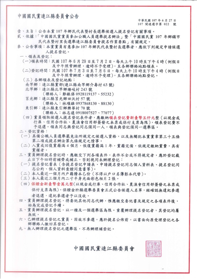 壹、主旨:公告本黨107年鄉民代表暨村長選舉候選人提名登記有關事項。
