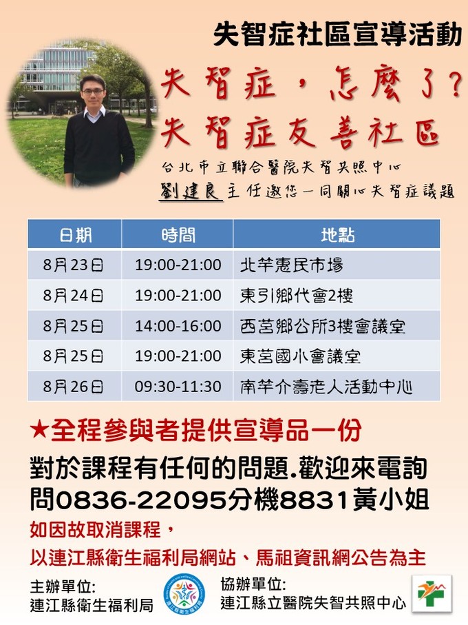 8/23(四)至8/26(日)連江縣衛生福利局特別邀請台北市立聯合醫院失智共照中心劉建良主任