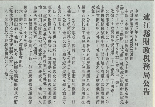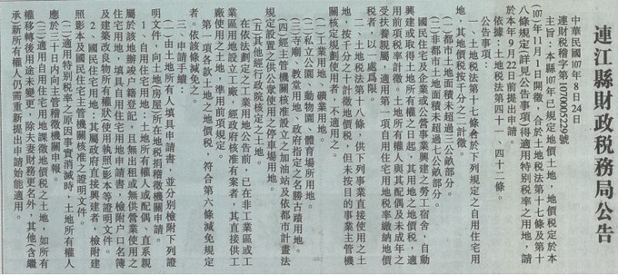 連江縣財政稅務局-地價稅減免公告
