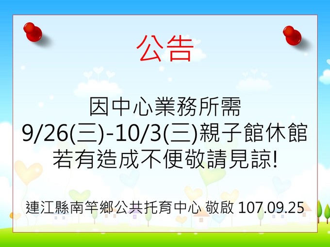 南竿公托_9/26(三)-10/3(三)親子館休館