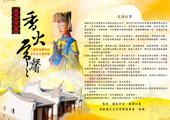 鐵板在努力修復歷史古蹟金板境天后宮喜於107年9月28日歡慶落成暨神尊安座大典,二百年風華再現,端賴政府挹注之外,各界善信大德鼎力捐輸,各友宮(廟)共襄盛舉會香,倍增熱鬧,方始慶典活動順利圓滿。謹藉媒體網路一端,表達萬分感謝之意。