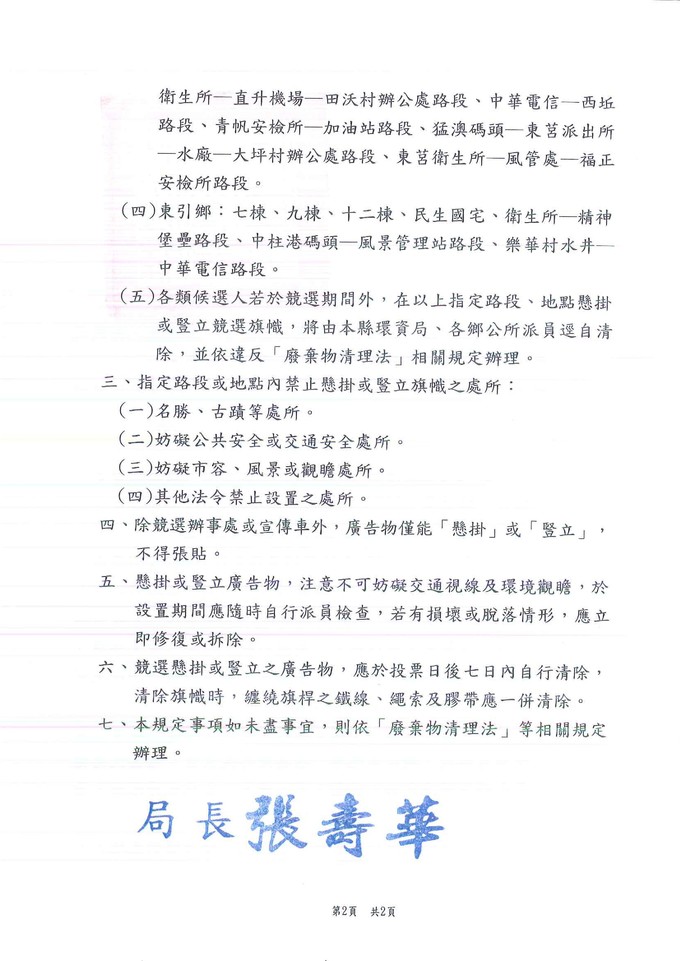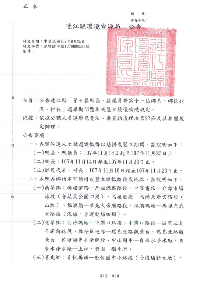 連江縣第七屆縣長、縣議員暨第十一屆鄉長、鄉民代表、村長選舉期間懸掛或豎立競選旗幟規定,如下圖: