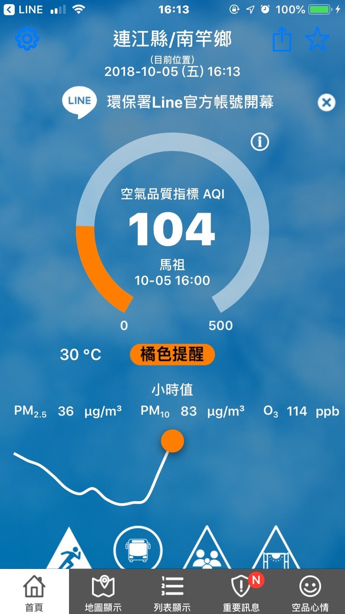 AQI指標已達對所有族群有影響 --閱讀人次 : 511 目前(10/05日16:00)空氣污染指標(AQI)已至104,為對敏感族群不健康,一般民眾如果有不適,如眼痛,咳嗽或喉嚨痛等,應該避免戶外活動。學生亦避免從事劇烈運動。