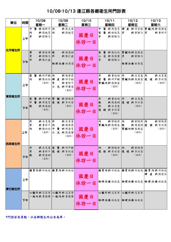 10/08-10/13連江縣各鄉衛生所門診表