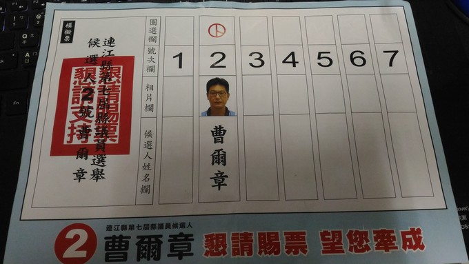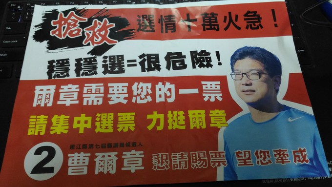 四年後,曹爾章再度披上競選彩帶,不同的是號次從「8」號換成「2」號,以及四年歲月的洗煉,讓文宣照片上的他,多了幾分已然更明世事的滄桑皺紋。