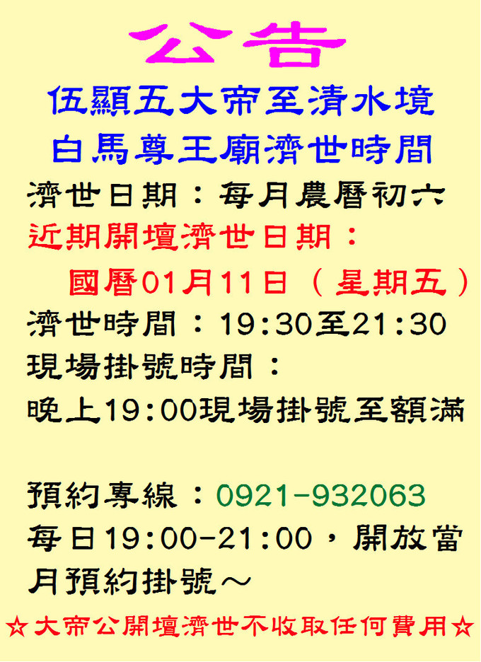 01/11 伍顯五大帝濟世公告暨點燈登記 --閱讀人次 : 948 國曆01月11日(星期五)伍顯五大帝至清水境白馬尊王廟濟世