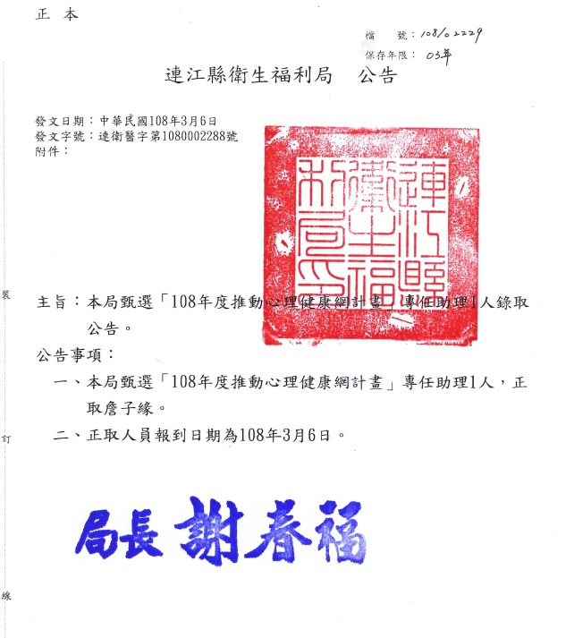 108年度心健網專任助理錄取公告