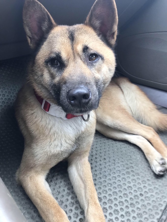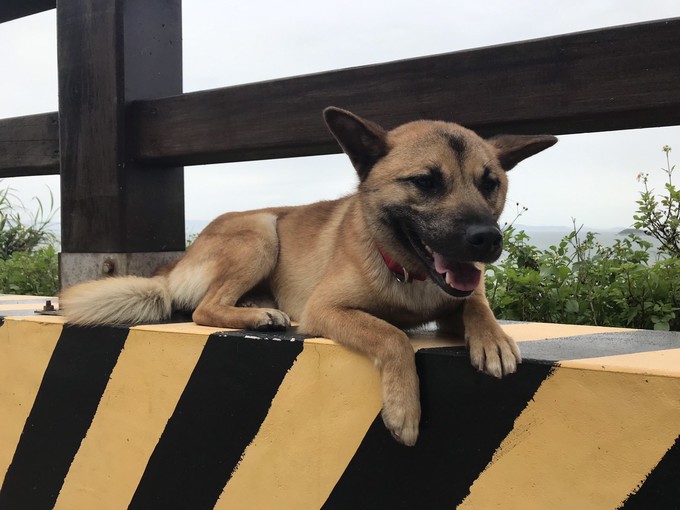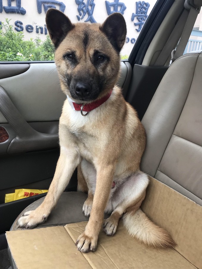 特徵:中小型米克斯,黃色毛,額頭中間有一條黑色毛,有戴紅色項圈。(如下照片)