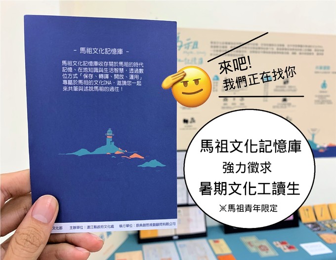 馬祖文化記憶庫暑假文化工讀強力徵求中 --閱讀人次 : 1102 暑假想要找點事情做,靠自己來賺點零用錢嗎?連江縣政府文化處委託原典創思顧問有限公司執行「馬祖文化記憶庫」計畫,今年提供青年學子提供一個好機會,讓你了解自己家鄉文化事,又能開心賺到零用錢,別猶豫,來吧!