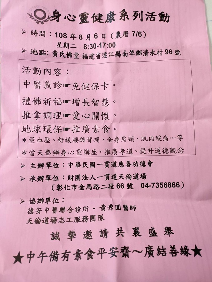 8/6 中醫義診&身心靈講座,備有素食