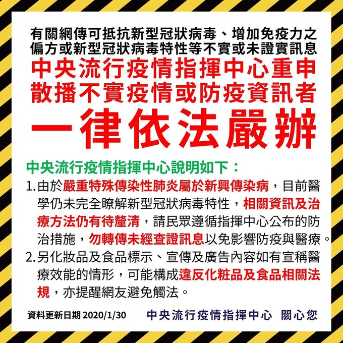 有關網路流傳可抵抗新型冠狀病毒、增加免疫力之偏方,或新型冠狀病毒特性之訊息,由於嚴重特殊傳染性肺炎係屬新興傳染病,目前醫學仍未完全瞭解新型冠狀病毒之特性,相關資訊及治療方法仍有待釐清,請民眾遵循指揮中心公布之防治措施,勿轉傳未經查證之訊息以免影響防疫與醫療。