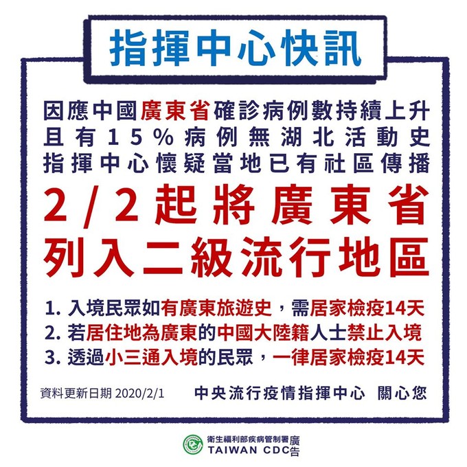 衛福局公告:今起小三通返馬民眾 強制居家檢疫14天 違者罰款 --閱讀人次 : 1852 因應中國大陸廣東省近日累積確診冠狀病毒肺炎病例數持續上升達520例,已有九成以上二級行政區發生病例,且有超過15%病例無湖北活動史、已出現多起群聚事件並有病例輸出至其它地區等社區傳播證據,中央流行疫情指揮中心昨(2/1)日召開專家諮詢會議決議將中國大陸流行地區判定,劃分為兩級:一級流行地區表示當地已出現明顯不易控制之社區傳播,目前湖北省已列為一級流行地區;二級流行地區表示懷疑當地已有社區傳播,有相關旅遊史應列入居家檢疫對象,並自今(2/2)日起將廣東省列為二級流行地區,居住地在廣東之陸人則禁止入境;另小三通入境者,明日起一律居家檢疫14天。