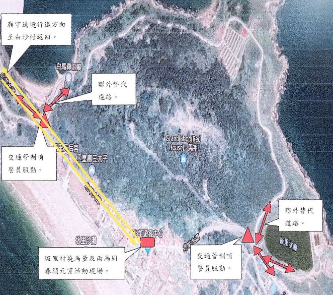 二、各村鄉親駕駛汽、機車要到白沙村,改用行駛聯外替代道路,請在坂里水廠右轉后浪坡方向,白沙村駕駛汽、機車要到各村鄉親,請在中澳路口左轉后浪坡方向。