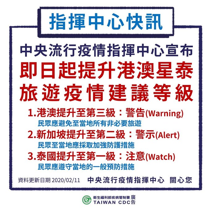 基於防疫安全,指揮中心今日宣布,即日起提升上述國家之旅遊疫情建議等級,其中港澳提升至第三級警告(Warning),民眾避免至當地所有非必要旅遊;新加坡提升至第二級警示(Alert),民眾至當地應採取加強防護措施;泰國提升至第一級注意(Watch),民眾應遵守當地的一般預防措施。