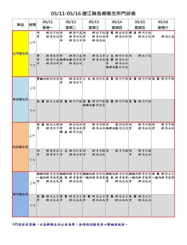 5/11-5/16衛生所門診表