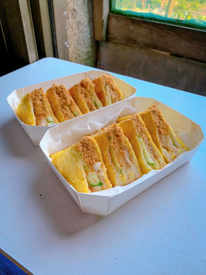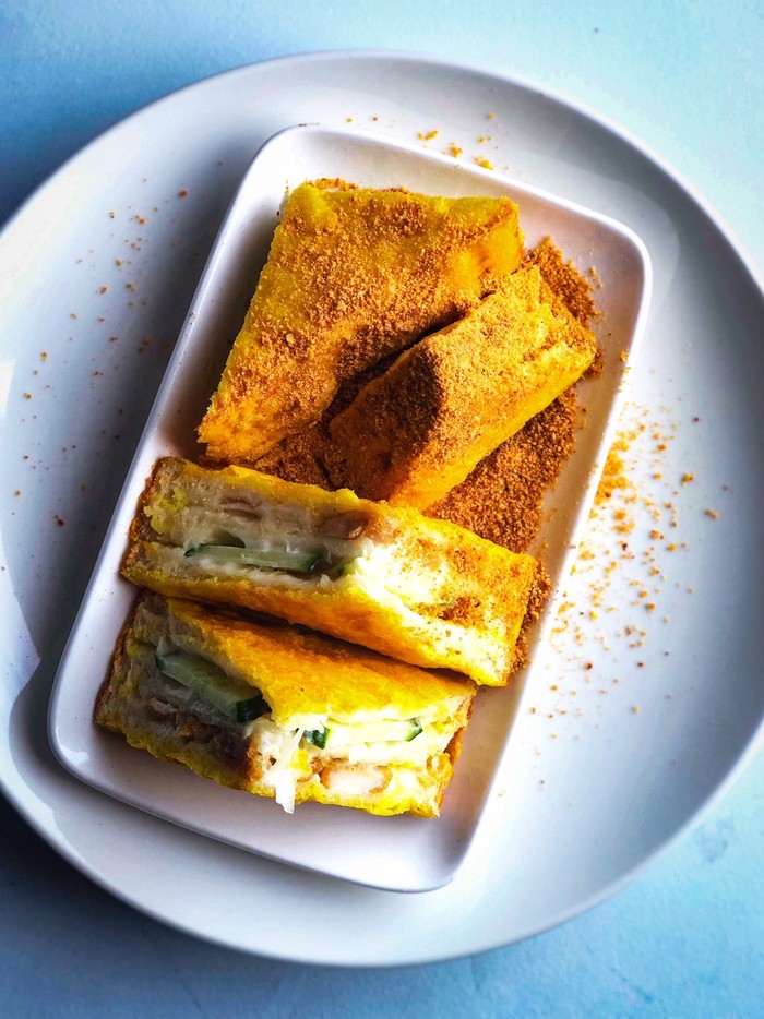 麵包裹著蛋液拿去油炸,金黃色的外皮搭配著花生粉的香氣撲鼻而來