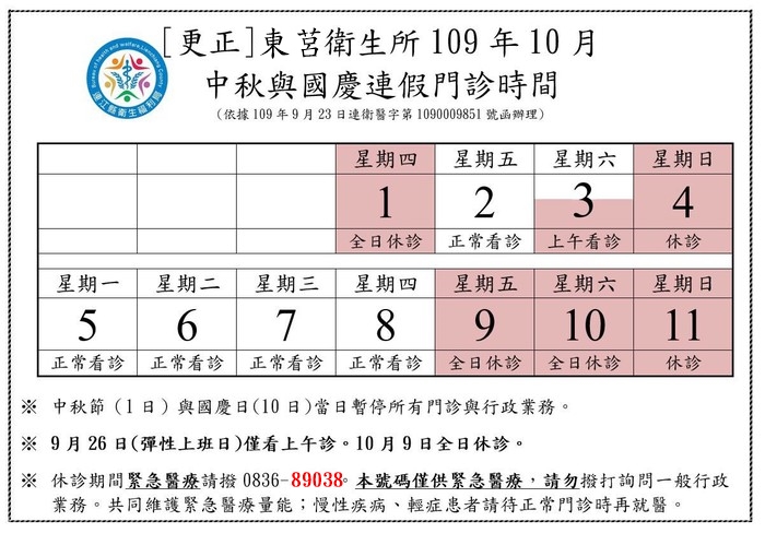 東莒衛生所原定10/9(五)正常開診,奉本縣衛生福利局來函指示調整為「全日休診」;國慶連假期間10/9(五)-10/11(日)衛生所僅提供「緊急醫療」服務,欲申辦各項行政手續,或開立慢性處方藥品的民眾,請您提早辦理。