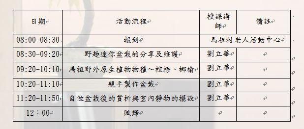 馬港社協109年野趣盆栽研習班開課啦! --閱讀人次 : 887 一、活動日期:109年 10月 17 日(星期六)
