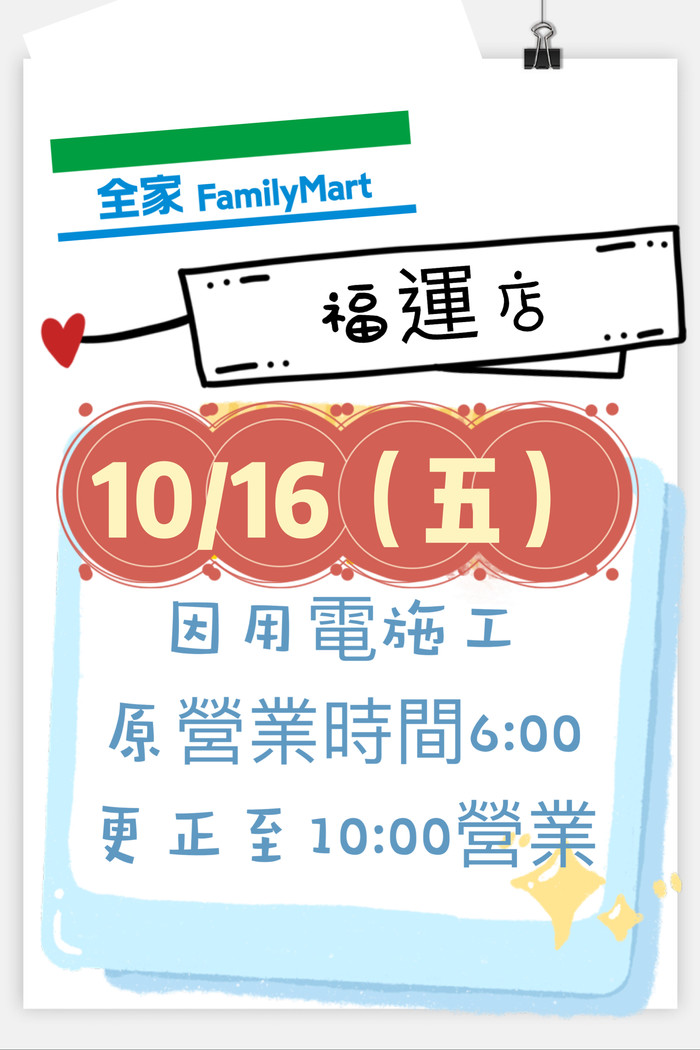 10/16全家「福運店」營業時間更動