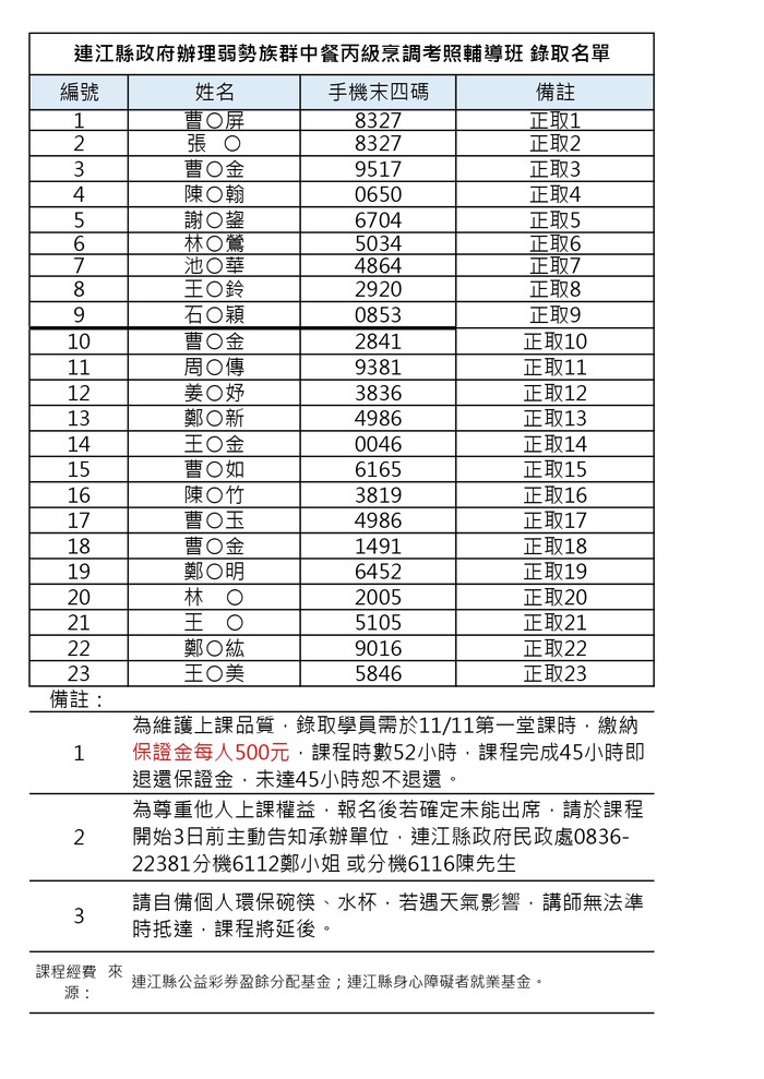 弱勢族群中餐丙級烹調輔導班錄取名單